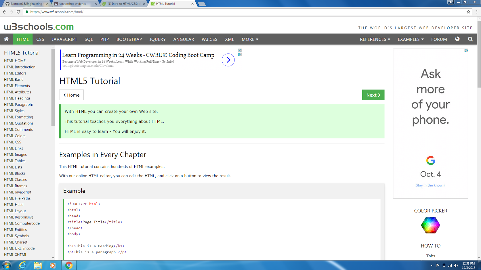 For these couple of weeks we have been learning about html. We spent about a week learning about html through multiple websites such as w3schools. We then created a github account, where we could work on our websites and share it with the public. Our first major project was to create a website that would link to an about me section and the projects I have worked on in my engineering class. Throughout the weeks we started learning more about coding. As we learned more our website started looking more appealing.